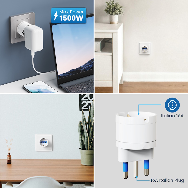 - Simple adapter for Italian plug 2P+E 16A and Italian/Schuko socket 2P+E 16A White color - 1 Italian/Schuko 16A electrical socket to power 1 electrical device - Modern design that does not take up space: all electrical outlets are easily accessible - Safe Charging: The power strip is equipped with Children Protection