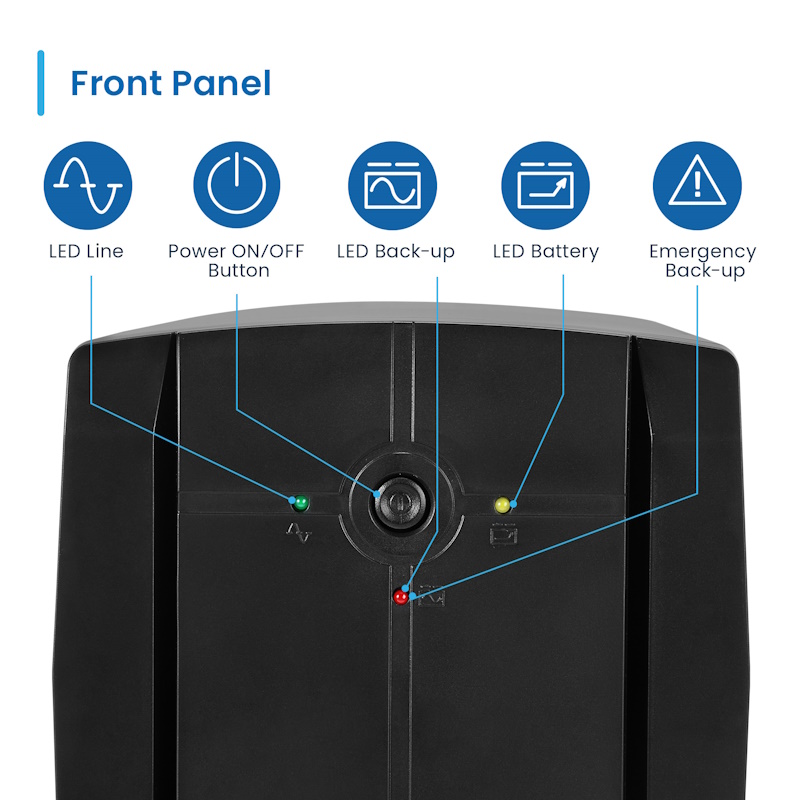 - LED notification during power outages - With LED status indicator: Line, Battery, Back-up - Single On/Off button - Input: 1x EU plug type F (Schuko) - Output: 3x EU type F socket female (Schuko) with surge protection - AVR function to stabilize the output voltage - Power-on self test; Automatic restart when mains power is restored - Auto track mains phase to ensure that inverter output voltage has same phase with utility voltage, reducing transfer time and peak surge - Protections: short circuit, battery overcharge/overdischarge, overload, overvoltage - Automatic recharging in OFF mode: in the presence of mains voltage and with the UPS off, the battery recharges automatically. This function ensures that, with the devices turned off and the UPS turned off, the batteries continue to recharge. - Protections: short circuit, battery overcharge/overdischarge, overload, overvoltage - Automatic recharging in OFF mode: in the presence of mains voltage and with the UPS off, the battery recharges automatically. This function ensures that, with the devices turned off and the UPS turned off, the batteries continue to recharge. - Line Interactive: interactive line technology