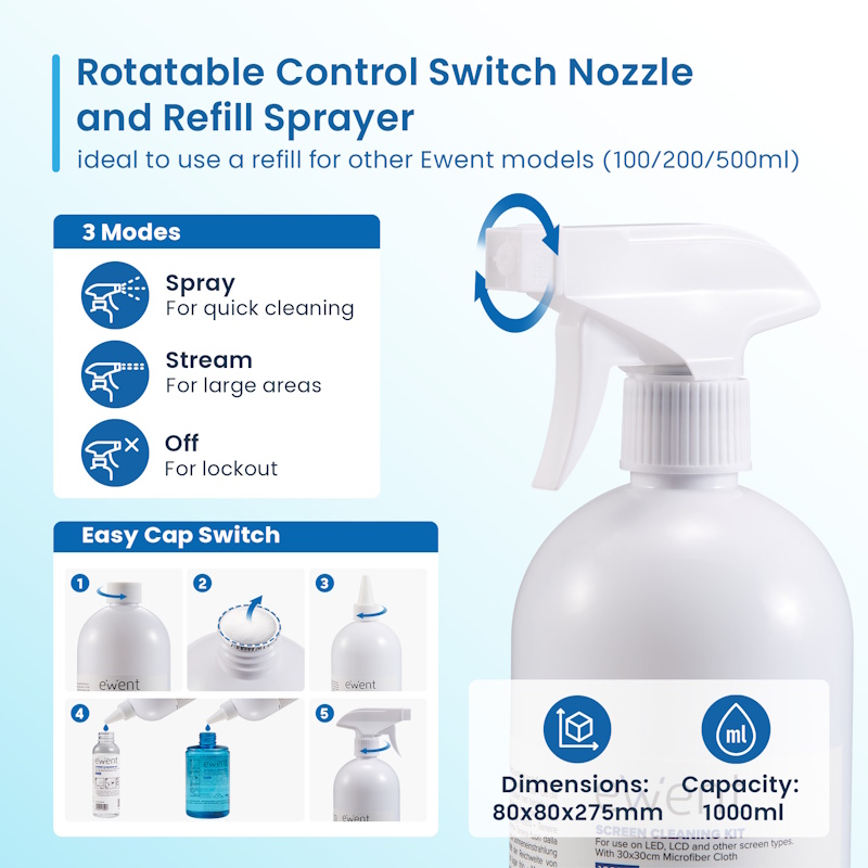 Suitable for use on LED, LCD, and other types of screens. Keep your valuable devices clean! - 1000ml cleaning solution for LED, LCD, and other types of screens, lenses, glass, fiber optics, plastic, and printer surfaces. - Antistatic: attracts fine dust, ideal for cleaning delicate electronic devices. Antibacterial: SGS tested. Made from a blend of plant extracts; fully biodegradable, alcohol-free, and ammonia-free. Dermatologically safe, non-abrasive, and odorless. - Extremely soft, lint-free, and 100% safe for cleaning dust, streaks, smudges, fingerprints, oils, and marks from screens, glasses, lenses, binoculars, telescopes, jewelry, and other delicate surfaces. No streaks or drips. - High-quality, tightly woven microfiber cloth: easy to wash and quick-drying. Hand wash with water only — do not use detergent or fabric softener. Do not bleach. Air dry only. - Spray nozzle with rotating control switch offering 3 modes: spray for quick cleaning; stream for large surfaces; off for locking. - Includes a dosing nozzle, ideal for using the EW5680 bottle as a refill for other Ewent models: 100ml (EW5668), 200ml (EW5671), and 500ml (EW5678). - Please check your device’s manual before using the cleaning liquid.