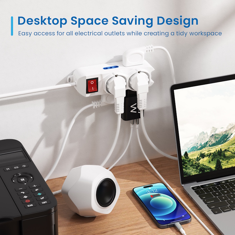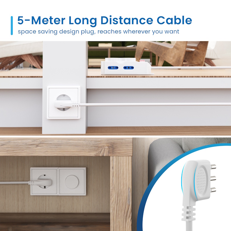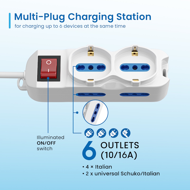 Powers 6 electrical devices! Compact and versatile! - 2 power sockets for Italian plugs (10/16A) and German - 4 power sockets for Italian plugs (10/16A) - Enable and disable all electrical sockets at once with the illuminated ON/OFF switch - Modern design that does not take up space: all electrical sockets are easily accessible - Safe charging: the power strip is equipped with overload protection and Child protection - Fastening eyelets for possible installation even on the wall - Cable: length 5.0 m - 4 non-slip feet to ensure you do not slip or fall from the table