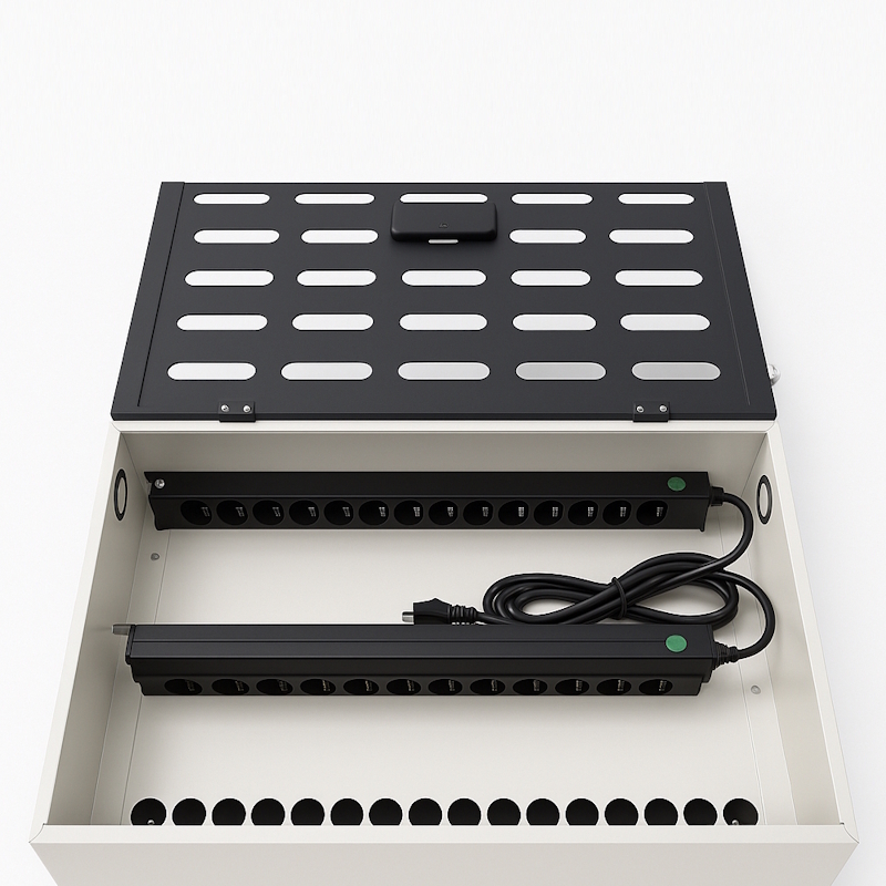 - Effortless setup with secure power management - Keyed secure power adapter storage area - Top compartment for AC adapters - Designated slots for clean cable setup - Instant charging with no hassle - Plug into any outlet for immediate charging - Efficient and reliable design for seamless charging