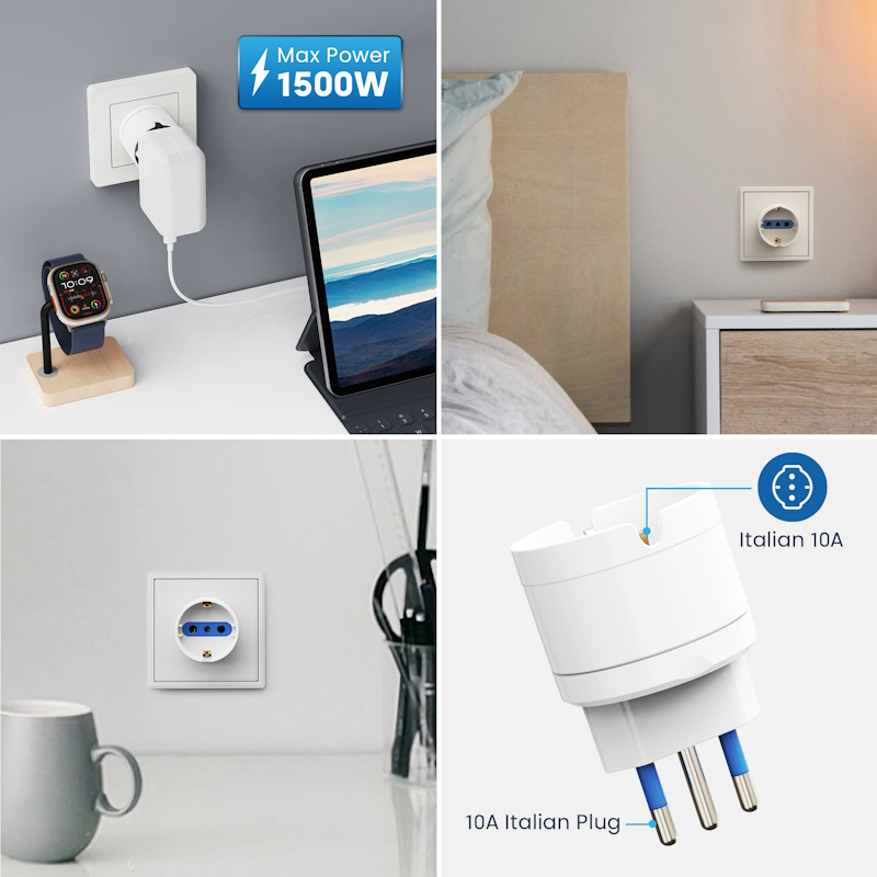- Adattatore semplice spina Italiana 2P+T 10A e presa italiana/Schuko 2P+T 10A Colore bianco - 1 presa elettrica Italia/Schuko 10A per alimentare 1 dispositivo elettrico - Design moderno che non occupa spazio: tutte le prese elettriche sono facilmente accessibili - Ricarica sicura: l’adattatore è dotata di protezione Bambin